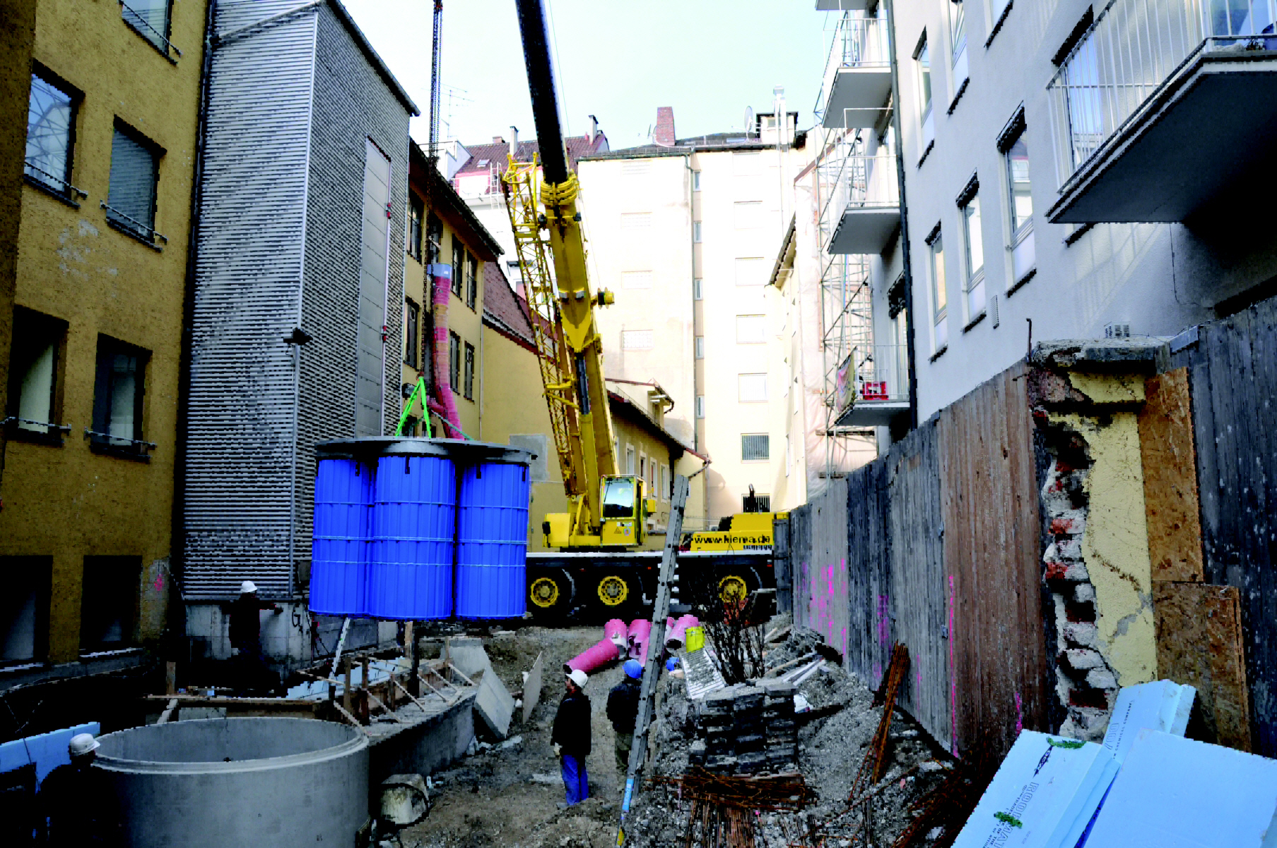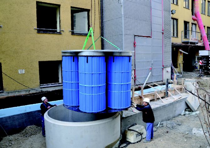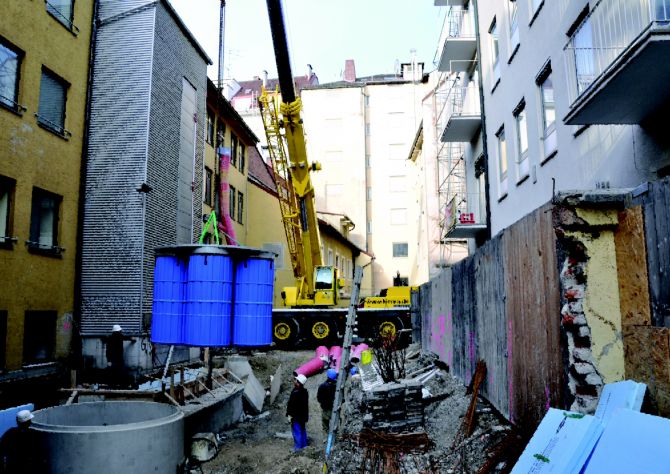 Die Innenstadtlage des Deutschen Theaters mit engen Straßen führte zu außergewöhnlichen Problemstellungen. So war z.B. der Einbau einer Rigole zur Versickerung nicht möglich, das Wasser sollte daher in einen bereits bestehenden Sickerschacht eingeleitet werden. Vorgesehen waren ursprünglich fünf Einzelschächte, die aber wegen des beengten Straßenraums nicht zu realisieren waren. Die fünf Filterschächte des 3P Hydrosystems 1000 metal wurden deshalb in einem einzigen großen Betonschacht mit drei Metern Durchmesser anschlussfertig eingebaut. Eine weitere Schwierigkeit stellte der stark kieshaltige Untergrund dar, der das Ausheben einer Baugrube unmöglich machte. Mit dem Büro Zickler+Jakob, München, wurde daher ein so genannter Abteufschacht als Lösung entwickelt. Der Betonring wurde an der Unterseite mit einer Metallschneide versehen, auf dem Gelände aufgesetzt und von innen ausgebaggert. Dadurch rutschte er nach und nach auch ohne Baugrube auf die gewünschte Tiefe ab. Nachdem sie erreicht war, wurde der Boden ausbetoniert. Mit Hilfe eines Autokrans wurde in München zuerst der Betonschacht eingebracht, nach Fertigstellung des Bodens und der Kernbohrungen für Zu- und Ablauf folgte die komplette Filtereinheit mit Arbeitspodest.
