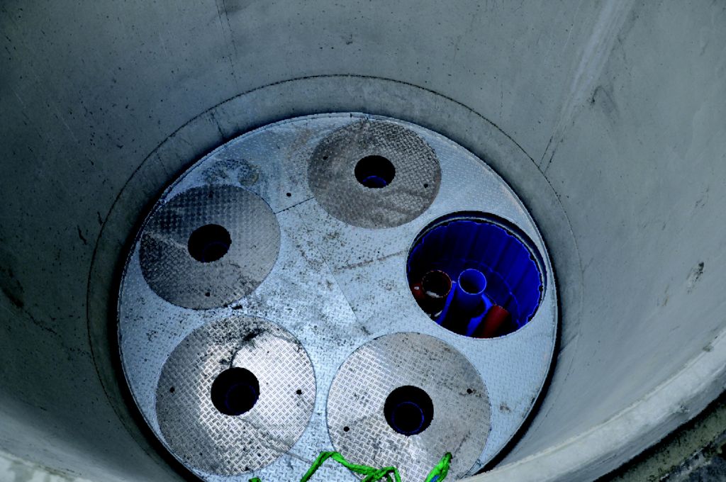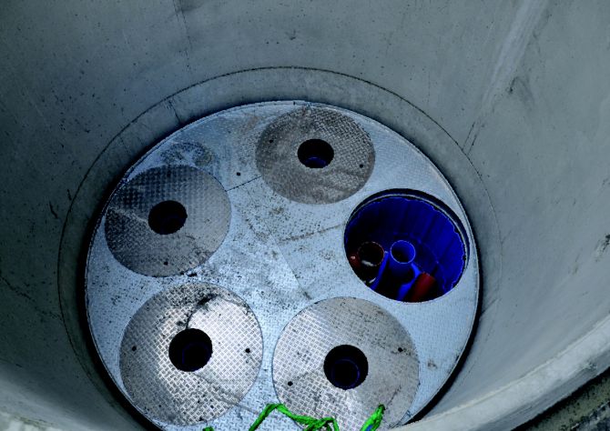 Um die Filtereinheit am Stück und in einem Hub in den Schacht absenken zu können, wurden die einzelnen Filtergehäuse mit Hilfe von Partnerfirmen aus der Metall- und Kunststoffverarbeitung auf eine Kunststoffplatte geschweißt und mit einem zentralen Zulauf- und Verteilerrohr ausgestattet. Damit ist eine gleichmäßige Beschickung aller Schächte durch das zentrale Zulaufrohr gesichert. Ein Arbeitspodest, das aufgrund der großen Einbautiefe von 5 m unerlässlich war, wurde als Metallkonstruktion werksseitig vormontiert. Damit lassen sich die künftig anfallenden Wartungs- und Reinigungsarbeiten für die Hydrosystem-Filterelemente einfach und sicher durchführen.