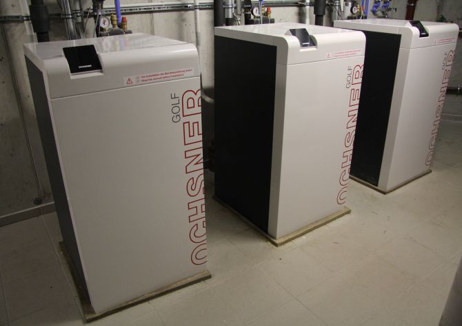 Im Einsatz sind insgesamt sieben Ochsner Wärmepumpen der Baureihe Golf Maxi plus, Typ GMLW 35 Plus mit einer Leistungsfähigkeit von maximal ca. 40 kW sowie sieben Tischverdampfer vom Typ VHS-M 35. Die Wärmepumpen liefern eine Leistungszahl (COP) von 4,1 bei L2/W35 und von 3,2 bei L-10/W35. Damit erzielt die Technik auch bei niedrigen Außentemperaturen einen guten Wärmeertrag. Für die Belieferung der Fußbodenheizungen, die alle Wohnräume mit Heizwärme versorgen, ist die Technik bestens gerüstet. Die Luft-Split-Wärmepumpen arbeiten mit einem Scroll-Verdichter mit doppeltem Druckausgleich und dem Arbeitsmittel R407C. Die Tischverdampfer vom Typ VHS-M 35 aus der Millenium-Serie zeichnen sich durch einen besonders leisen Lauf aus, mit „Silent Mode“ und „Super Silent Mode“ sind die GMLW-Modelle aktuell die leisesten Wärmepumpen im Markt. Verantwortlich dafür ist die stufenlose Regelung der Lüfter durch die Steuertechnik OTE 3.0. Zusätzlich besitzen die Wärmepumpen eine individuell einstellbare Schall-Nachtabsenkung. „Dass Geräuschbelästigungen der Anwohner so gut wie ausgeschlossen sind, war für uns ein weiteres wichtiges Entscheidungskriterium“, berichtet Fahrner.