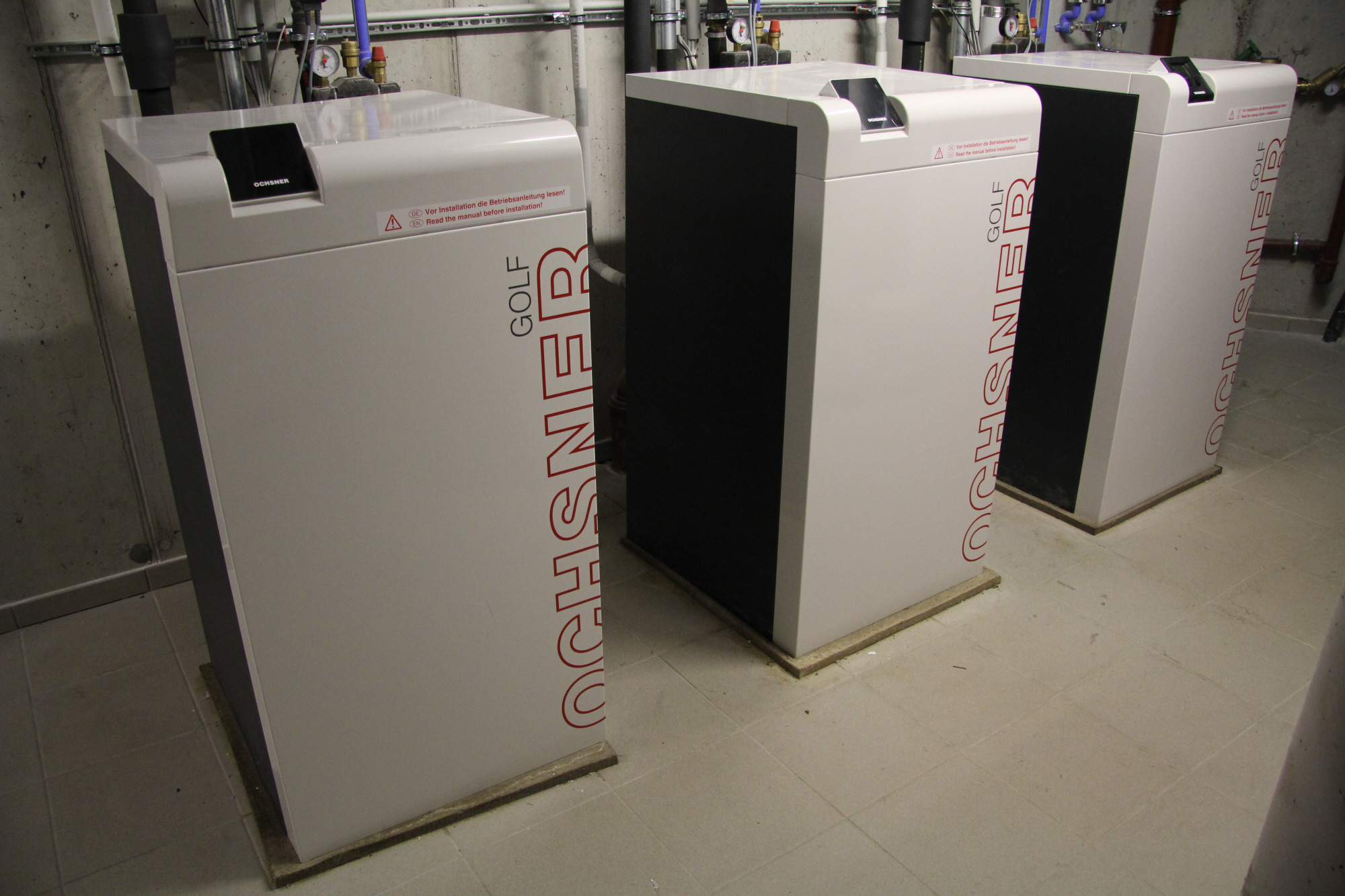 Durch die ausführende Installationsfirma, den Ochsner Systempartner RORA Installationen GmbH, wurden die Wärmepumpen in zwei Kaskaden à zwei sowie einer Kaskade à drei Wärmepumpen geschaltet. So ist eine flexible Anpassung der Leistung an den aktuellen Bedarf durch Zu- oder Abschaltung von Wärmepumpen innerhalb der Kaskade möglich. Zur Wärmespeicherung für Heizung und Warmwasser kommen pro Kaskade je ein Ochsner PU2000 und ein Ochsner PU2000 mit hygienischer Warmwasserbereitung zum Einsatz. Die Speicher haben ein Fassungsvermögen von je 2.000 Litern und besitzen eine hocheffiziente Polyurethan-Hartschaum-Isolierung. Da die eingesetzten Wärmepumpen serienmäßig Vorlauftemperaturen bis zu 65°C im reinen Wärmepumpenbetrieb erreichen können, ist der Legionellenschutz im Trinkwasserbereich sichergestellt.