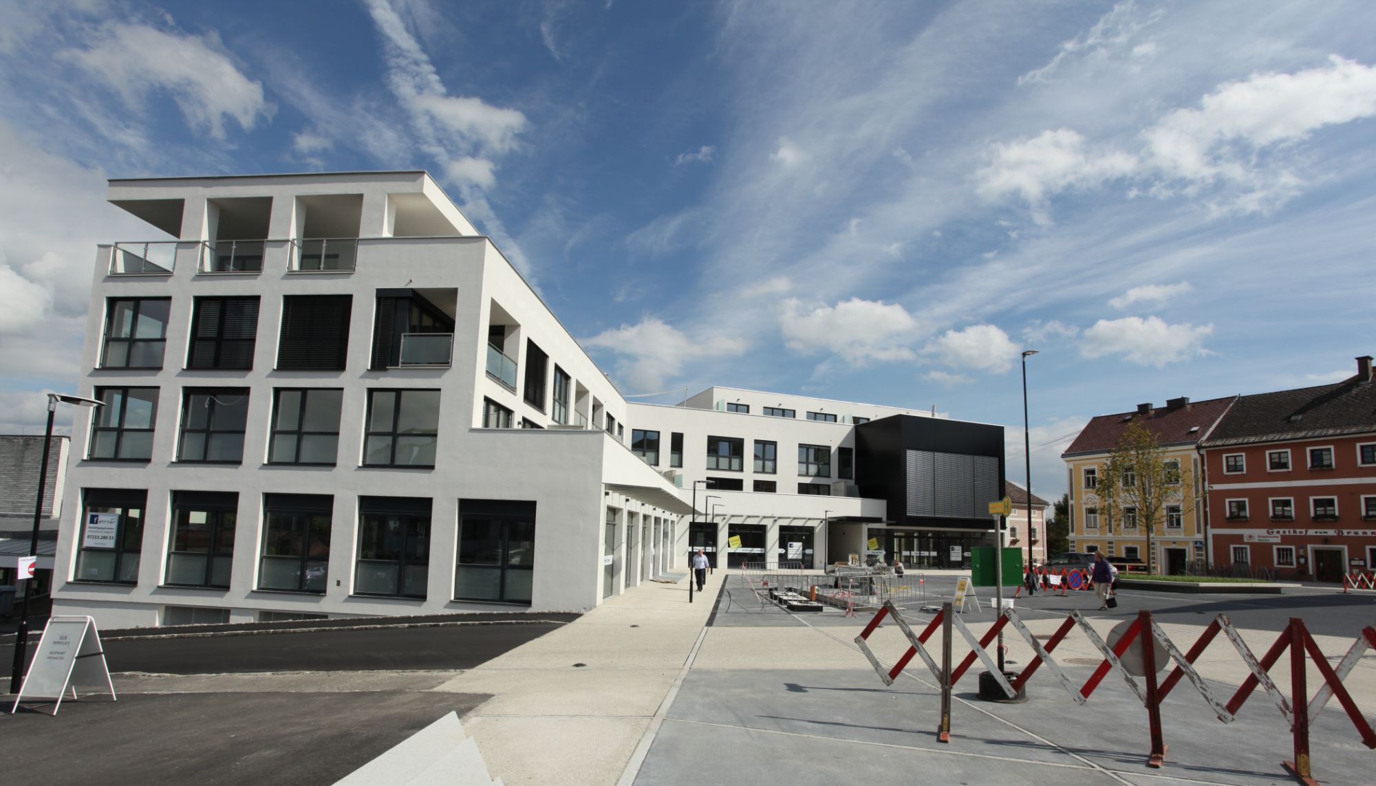 In zentraler Lage der oberösterreichischen Gemeinde St. Martin errichtete der Bauträger und Architekt Fahrner GmbH einen Wohn-, Geschäfts- und Bürohaus-Komplex mit 10.000 m2 Bruttofläche und einer Netto-Wohnfläche von etwa 6.000 m2. Das neue Gebäude liegt gegenüber dem alten Gemeindehaus, direkt am Ortsplatz der im Zuge des Neubaus ebenfalls komplett neu gestaltet wurde. Es umfasst 10 exklusive Maisonette- und Penthouse-Wohnungen mit einer Größe zwischen 67 und 120 m2 sowie 24 Mietwohnungen zwischen 57 und 115 m2, wahlweise mit Blick auf den Marktplatz oder ins Grüne. Geschäftsräume für Ladengeschäfte und Büros sowie der Gemeindesaal für Veranstaltungen sind ebenfalls in den Gebäudekomplex integriert und schaffen eine gute Infrastruktur für die Bewohner.