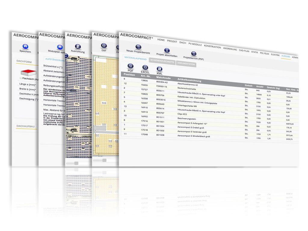 Aus der errechneten Dachbelegung erzeugt die Software eine Materialliste mit detaillierten Stücklisten, die auch nachträglich durch den Planer bearbeitet werden können. Der Leistungsumfang der Software versetzt den Anwender in die Lage, die Angebotserstellung und Planung auch ohne Begehung des Objekts durchführen und so Zeit und Personal zu sparen. Zudem kann dem Kunden bereits zum Angebot eine norm- und regelgerechte Systemstatik zusammen mit dem Ballastierungsplan vorgelegt werden. Für weitergehende Fragen zu Planungen zur Dachbelegung oder zur Angebotserstellung steht Kunden und Interessenten der Aerocompact Planungsservice zur Verfügung.