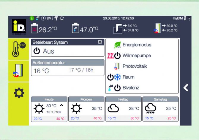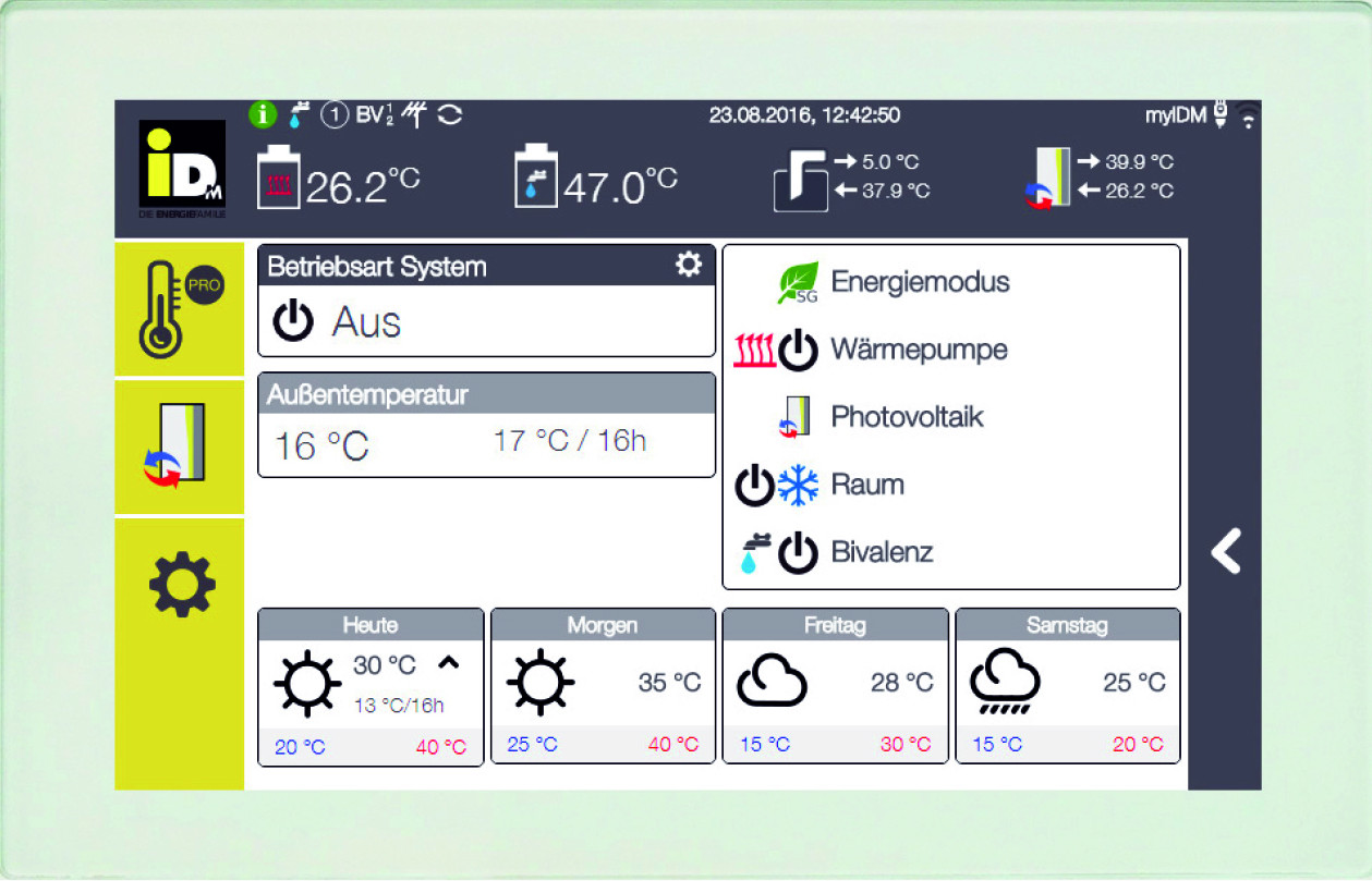 Die Navigator 2.0 Wärmepumpenregelung von iDM besitzt ein sieben Zoll großes, kapazitives Touch-Display. Eine innovative Menüführung auf dem übersichtlich gestalteten großen Display steht für einfache Bedienung mit hohem Komfort. Bis zu sechs Heizkreise lassen sich mit dem System individuell und unabhängig voneinander steuern. Die Regelung ist direkt am Display, über eine App auf dem Smartphone bzw. Tablet PC oder über BUS-Systeme und Gebäudeleittechnik steuerbar.