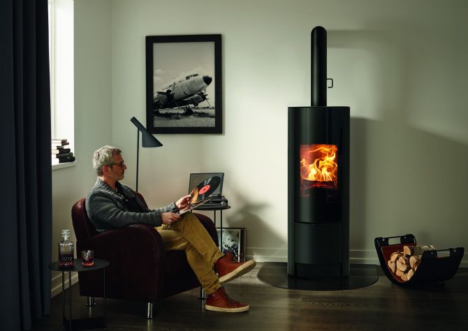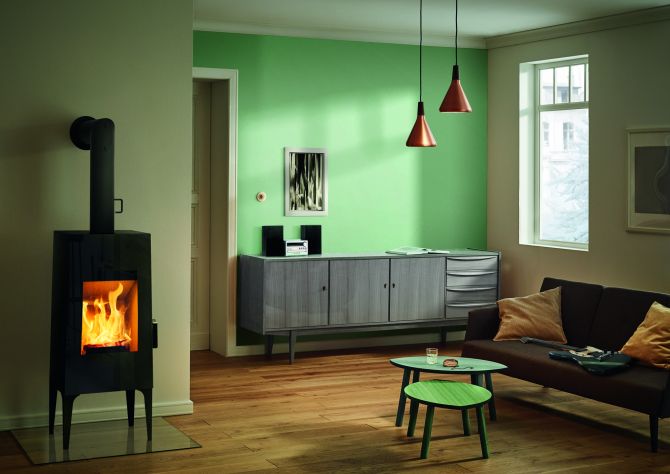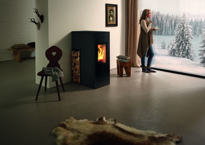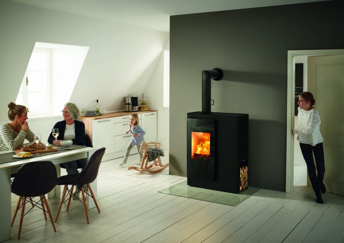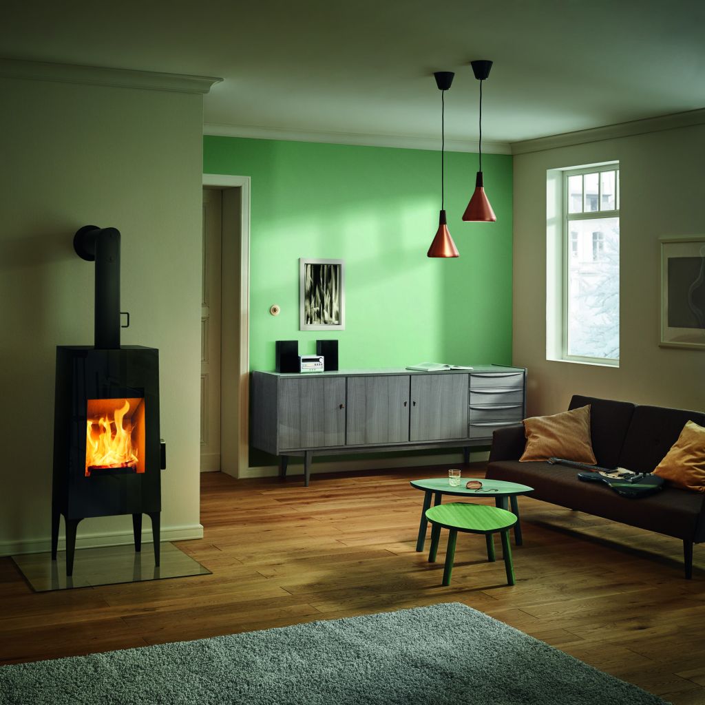 Die schmale, dafür aber tiefe Bauform zeichnet das Rika Kaminofen-Modell Cooper aus. Es eignet sich damit auch als Raumteiler und passt zu verschiedenen Einrichtungsstilen von Landhaus bis Loft. Praktisch: Ein Holzlagerfach ist optisch ansprechend bereits hinter dem Brennerraum integriert. Technisch bietet der Ofen Einhandbedienung, er kann raumluftunabhängig nach DIN betrieben werden.