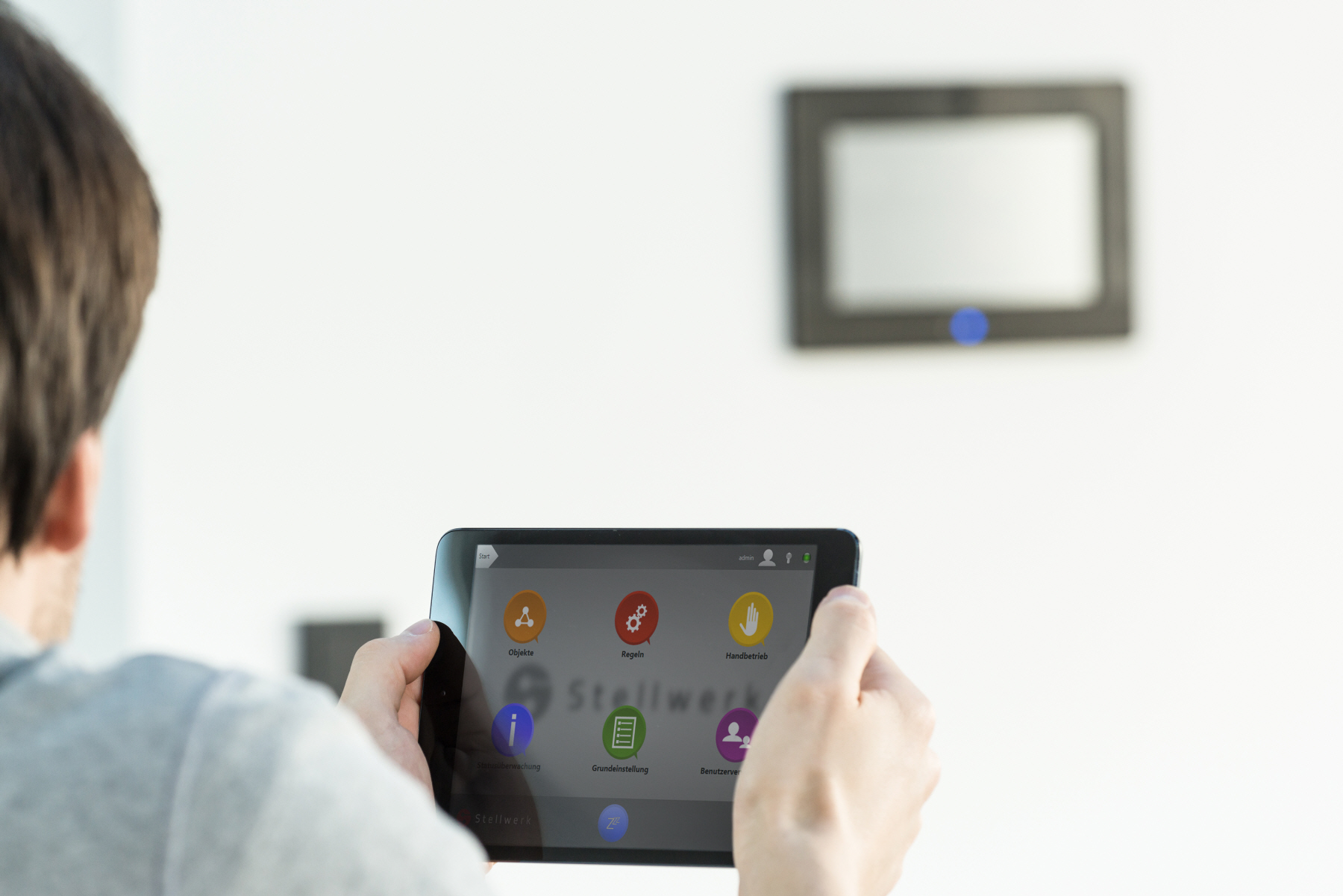 Die Stellwerk Software für die zentrale Steuerung und Regelung läuft auf einem Touch-PC, der sich an jeder gewünschten Stelle im Haus anbringen lässt. Er wird als „Schalter“, aber auch für die Programmierung und Visualisierung der Einstellungen genutzt. Zusätzlichistdie Bedienung mit einem vorhandenen PC über den standardmäßig verwendeten Internetbrowser denkbar. Über iPhone und iPad oder Android-Geräte ist die Steuerung ebenfalls möglich, zu Hause etwa über WLAN, oder von unterwegs über jeden Internetzugang.