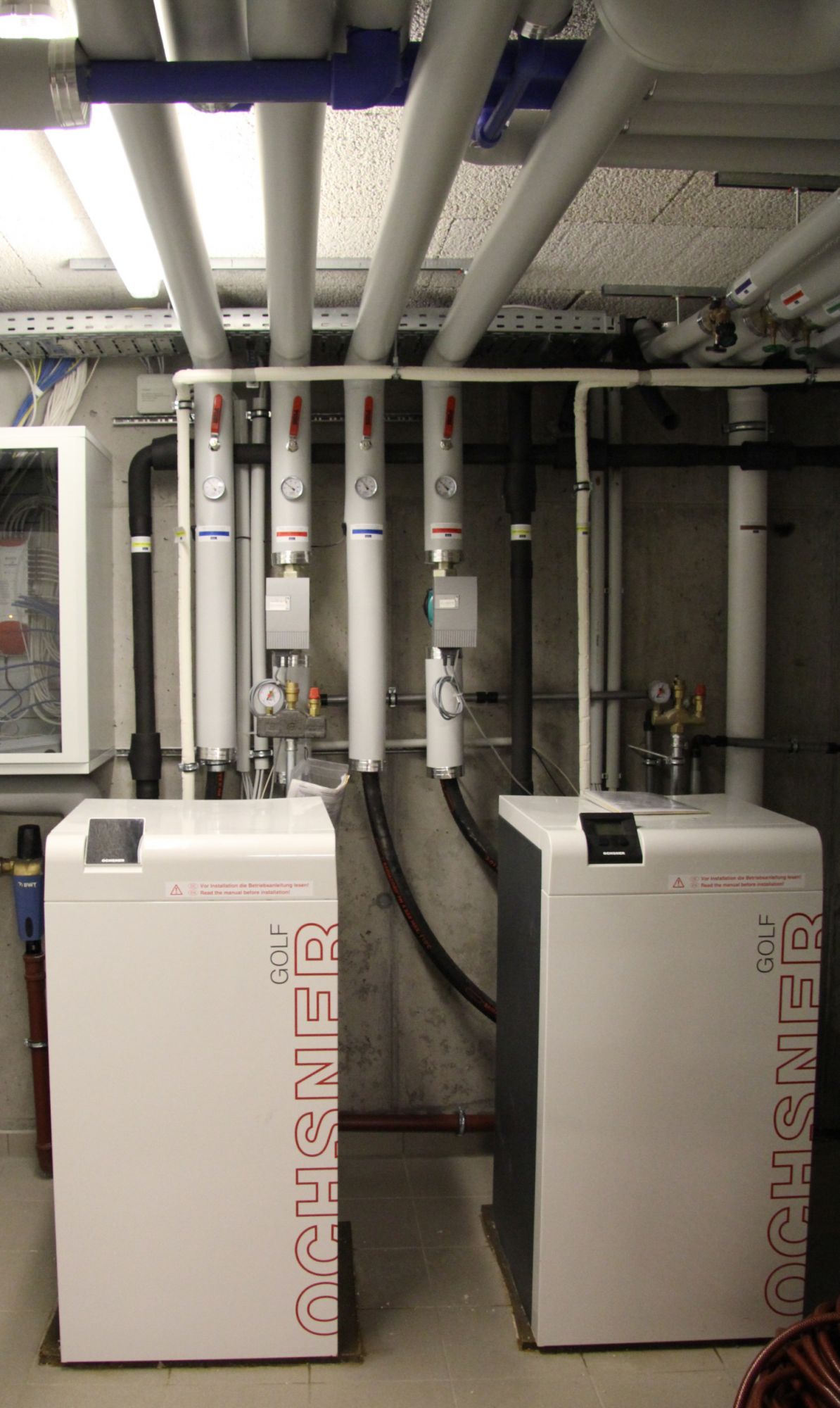 Durch die ausführende Installationsfirma, den Ochsner Systempartner RORA Installationen GmbH, wurden die Wärmepumpen in zwei Kaskaden à zwei sowie einer Kaskade à drei Wärmepumpen geschaltet. So ist eine flexible Anpassung der Leistung an den aktuellen Bedarf durch Zu- oder Abschaltung von Wärmepumpen innerhalb der Kaskade möglich. Zur Wärmespeicherung für Heizung und Warmwasser kommen pro Kaskade je ein Ochsner PU2000 und ein Ochsner PU2000 mit hygienischer Warmwasserbereitung zum Einsatz. Die Speicher haben ein Fassungsvermögen von je 2.000 Litern und besitzen eine hocheffiziente Polyurethan-Hartschaum-Isolierung. Da die eingesetzten Wärmepumpen serienmäßig Vorlauftemperaturen bis zu 65°C im reinen Wärmepumpenbetrieb erreichen können, ist der Legionellenschutz im Trinkwasserbereich sichergestellt.