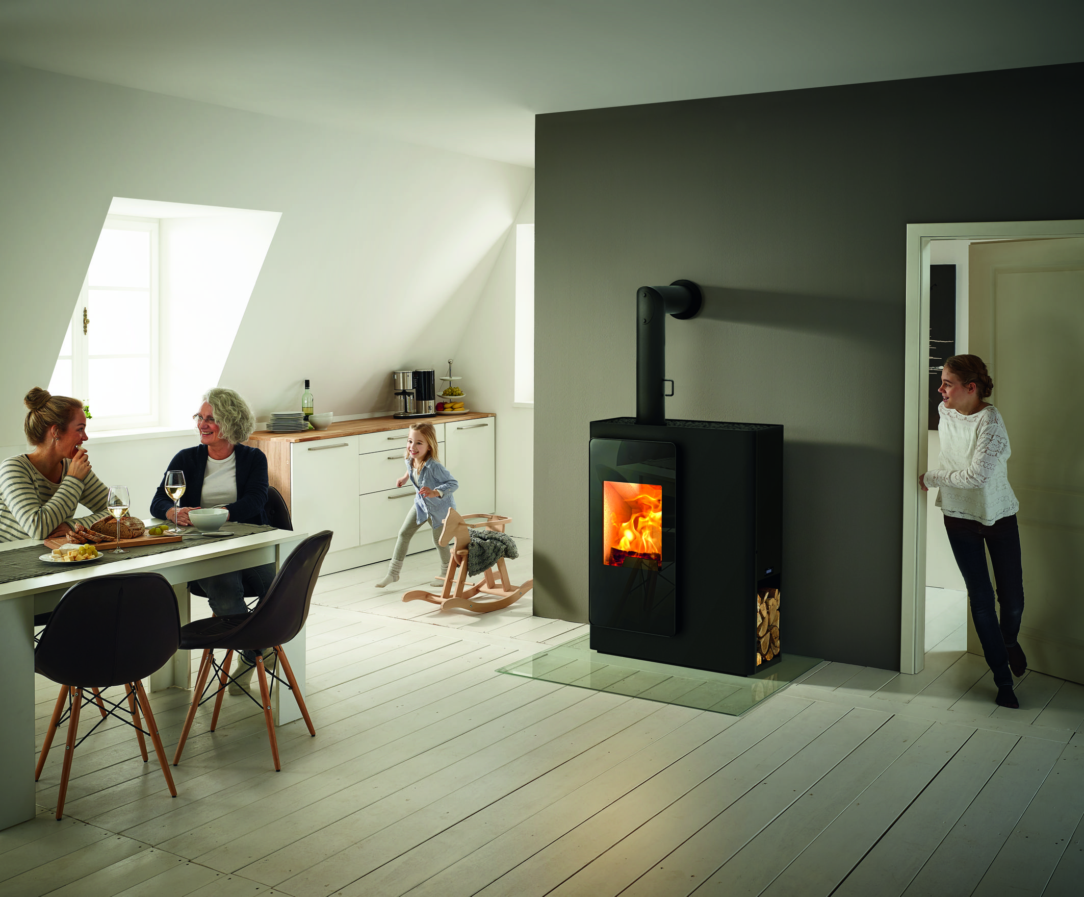 Der Kaminofen Forma zeigt sich in klarer geometrischer Form und mit einer Glasscheibe über Eck, die das Feuer von zwei Seiten einsehbar macht. Mit seiner schlanken Silhouette setzt Rika Akzente im Raum und macht auch als Ecklösung eine gute Figur.